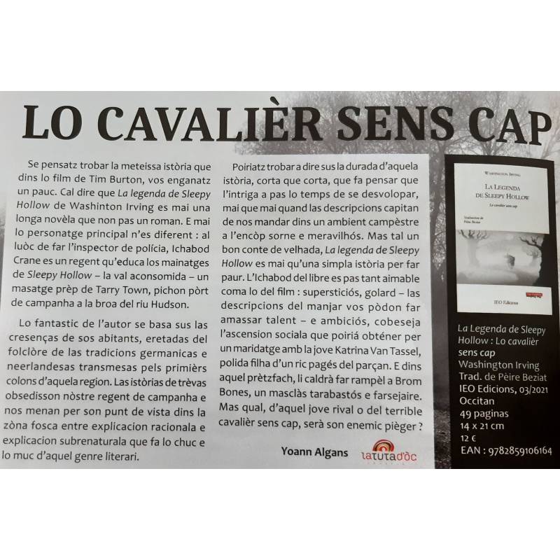 La Legenda de Sleepy Hollow - Lo cavalièr sens cap - Washington Irving. Dans la vallée endormie de Sleepy Hollow, le temps semble comme figé. Mais le fantôme du cavalier sans tête, qui hante la vallée depuis la guerre d’indépendance, fait le guet. Traduction occitane à partir de l’anglais (américain) de Pèire Beziat. Collection Flor Envèrsa, IEO edicions.