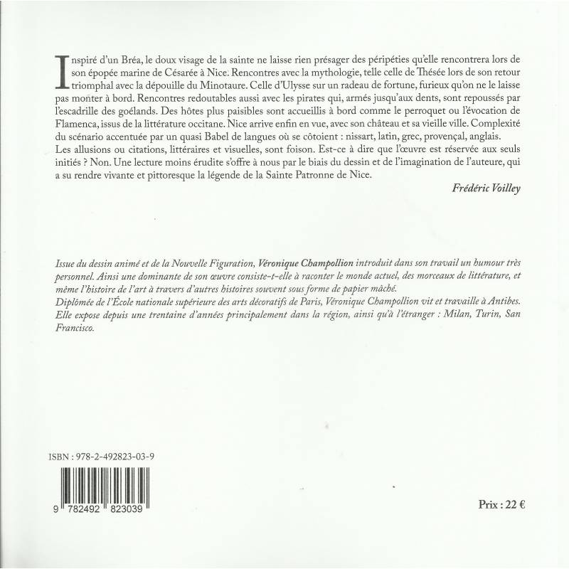 Inspiré d'un Bréa, le doux visage de la sainte ne laisse rien présager des péripéties qu'elle rencontrera lors de sib épopée marine de Césarée à Nive. Rencontres avec la mythologie, telle celle de Thésée lors de son retour triomphal avec la dépouille du Minotaure. Celle d'Ulysse sur un radeau de fortune, furieux qu'on ne le laisse pas monter à bord. Rencontres redoutables aussi avec les pirates qui, armés jusqu'aux dents, sont repoussés par l’escadrille des goélands. Des hôtes plus paisibles sont accueillis à bord comme le perroquet ou l'évocation de Flamenca, issus de la littérature occitane. Nice arrive enfin en vue, avec son château et sa vieille ville. Complexité du scénario accentuée par un quasi Babel de langues où se côtoient : nissart, latin, grec, provençal, anglais.