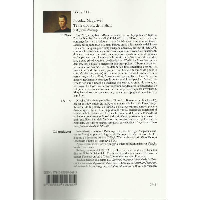 En 1615, a Ingolstadt (Bavièra), se cremèt en plaça publica l'efigia de l'italian Nicolau Maquiavel (1469-1527). Las Glèisas de l'epòca son convençudas - e o proclaman - que Lo Prince, son obra famosa, foguèt escrita per la quita man de Satan. Perqué un tal odi al respècte del libre e son autor? Perqué aquel obratge mager e universal, paregut al sègle XVI, continua fins ara a sentir a sofre? Las responsas se troban, evidentament, dins son contengut: una istoria naturala consacrada, non pas als animals e a las plantas, mas a l'univers de la politica. « Istoria » que cal entendre, aici, al sens grec d'enquesta, de descripcion. D'efièit Lo Prince descriu fre-dament, sense jutjar, lo menament dels afars politics. Observator de ter-ren, son autor nos mostra - en defora dels filtres metafisic e moral - la logica intèrna de las causas, çò que mou l'òme o la femna de poder, e cossí s'endevenon (o pas) amb los eveniments. Per aital nos mostra una vertat que, emai la solfine, l'umanitat vol ignorar. Es tot l'interès de son discors, fidèlament e fort agradivament traduit aicí per Joan Massip : fa vesedor çò que s'amaga a l'endarrièr dels vels que son las doctrinas, las ideologias, las filosofias. Per son escritura, fondada sus la coneissença de la logica de las situacions umanas e de las passions que las investisson, Maquiavèl desvela una realitat que, per natura, repugna al desvelament :