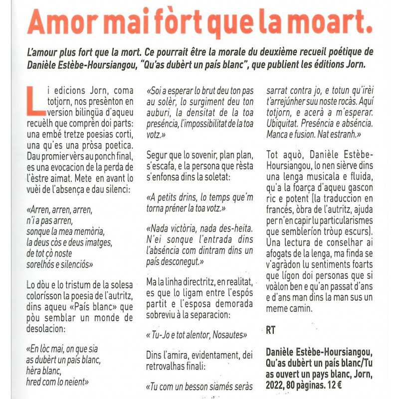 Qu'as dubèrt un país blanc - Tu as ouvert un pays blanc - Danièle Estèbe-Hoursiangou. Petit recueil de poésie en occitan, des poèmes brefs sur le rapport au monde physique du corps et de la conscience, et une prose poétique adressée à l'époux défunt. Bilingue occitan et français. Éditions Jorn.