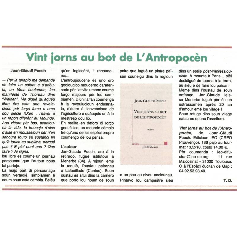Vint jorns au bot de l'Antropocèn - Joan Glaudi Puech. Roman contemparanèu en occitan provençau. Rabalhat per la polícia sus un trepador de vila, desvariat, amnesic, ablasigat, lo plaçan dins un espital psiquiatric… L'òme en question, Marc Belpuèch, conta son istòria. A tots n°239 (IEO edicions).