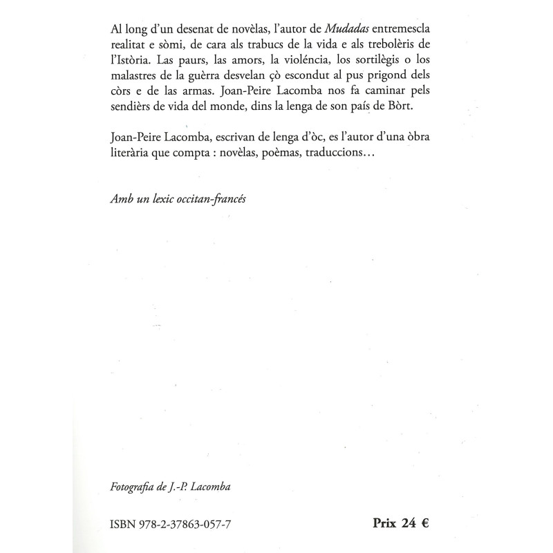 Mudadas - Joan-Peire Lacomba. Recuelh de novèlas onte l’autor entremescla realitat e sòmi, de cara als trabucs de la vida e als trebolèris de l’Istòria. Las paurs, las amors, la violéncia, los sortilègis o los malastres de la guèrra desvelan çò escondut al pus prigond dels còrs e de las armas. Letras d'òc.